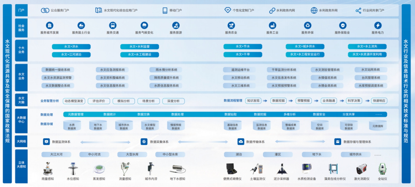 充分利用智能感知技术和通信技术,构建空天地一体化综合感知网,对涉水对象属性及其环境状态进行监测和智能分析,从物理流域中获取水利数据和信息。