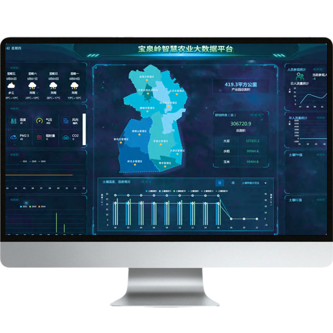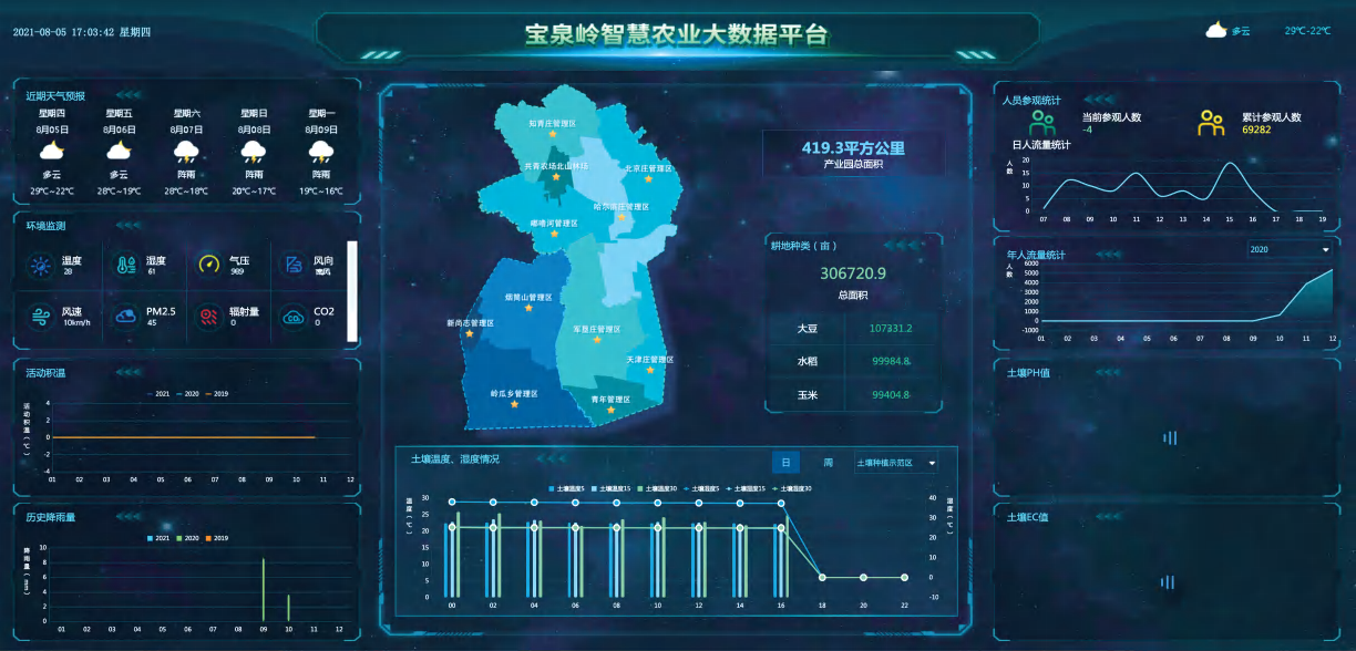 该项目通过对大田、玻璃温室室内物联网监控,实现对整个温室的自动控制以及对种植区的精准灌溉。同时,通过高低空对农场进行检测,高空实现地块划分,低空实现视频展现、三维实景模型与全景展示。通过建立综合管理平台,实现日常办公和整个园区的综合监控与管理。建立农业可视化大数据中心,通过采集的数据实时展示与分析,同时构建数字园区三维游览系统,实现虚拟导览与日常管理。