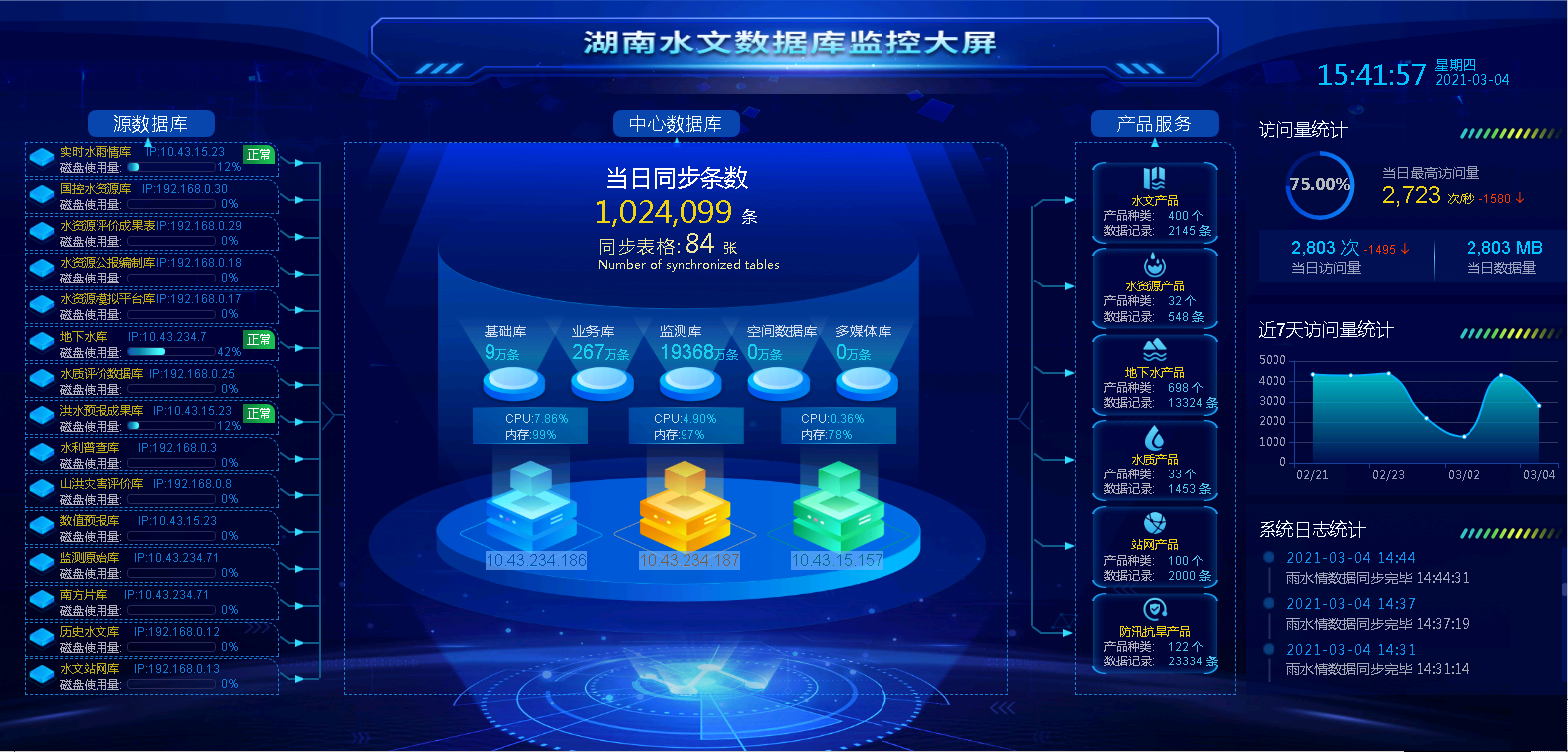 2020年12月份正式运行,原有业务库15个,通过设计创建1538张库表,融合为监测、基础、业务、空间、多媒体、元数据六大标准数据库,完成数据资源目录梳理,共包含2668张表, 实现了湖南省水文局“一数一源”、“一站一码” 。