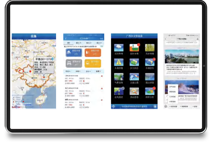 移动端产品包括移动会商、手机报汛、移动巡检、应急管理、全景拍照等功能,通过便捷方式实现信息自动推送、移动综合会商、语音交互、公众服务,用户覆盖黑龙江、吉林、内蒙古、广西、宁夏、贵州、河北、江西等地。