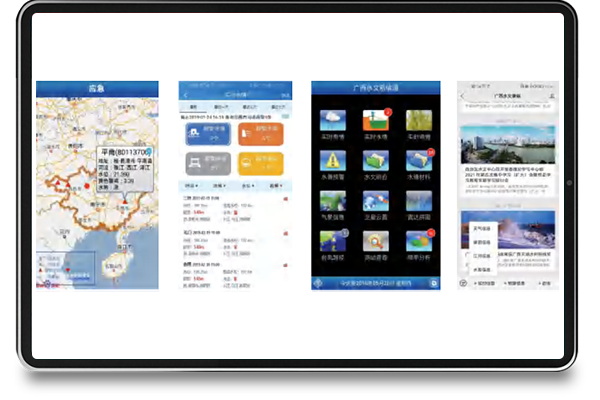 移动端产品包括移动会商、手机报汛、移动巡检、应急管理、全景拍照等功能,通过便捷方式实现信息自动推送、移动综合会商、语音交互、公众服务,用户覆盖黑龙江、吉林、内蒙古、广西、宁夏、贵州、河北、江西等地。